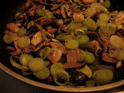 İnce doğranmış bir adet pırasayı, 150 gr istiridye ve 150 gr kestane mantarıyla birlikte zeytinyağında tuz ve karabiber ilavesiyle az pişmiş şekilde soteleyip bir kaba alıyoruz.